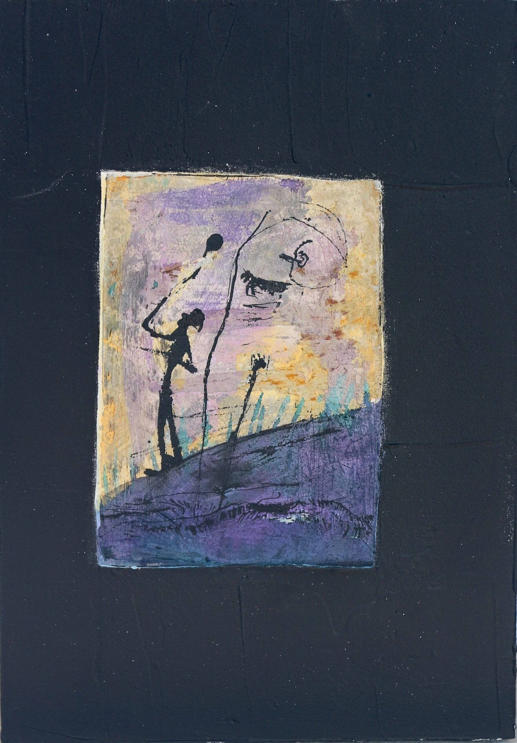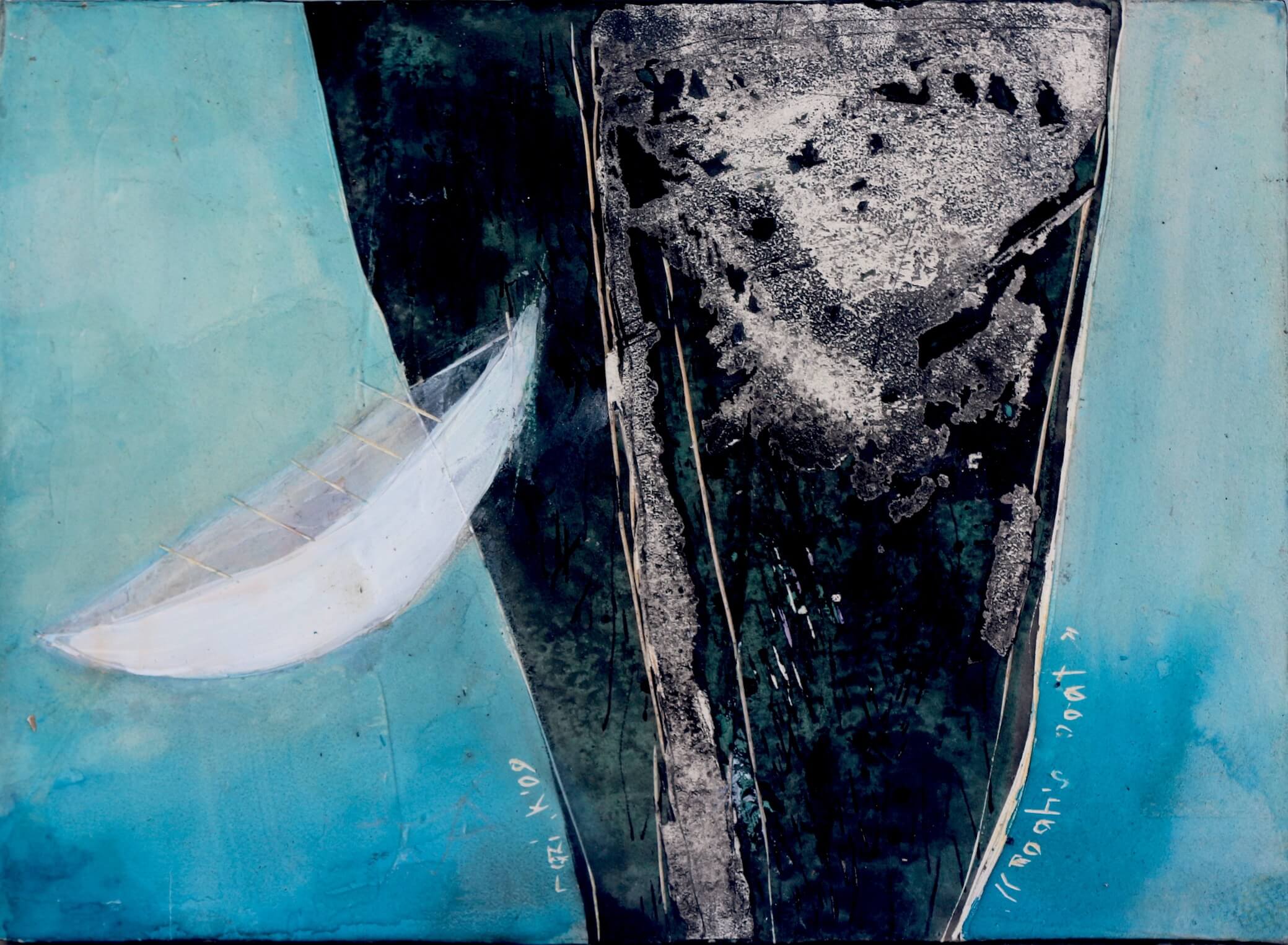 “Gurbet Kuşları (Birds of Exile) the artist says, ‘is the unearthing of her forgotten joint work and bidding a fond farewell to the project.’ These are mixed technique on wood. These works interplay word with image…a discussion between a painter and a poet. The poet looks at the painting and writes, the artist hears the poem and paints. Obviously they met in the motherland of exile. Purple-black prayers are on these paintings, along with those who fled and those who could not escape.